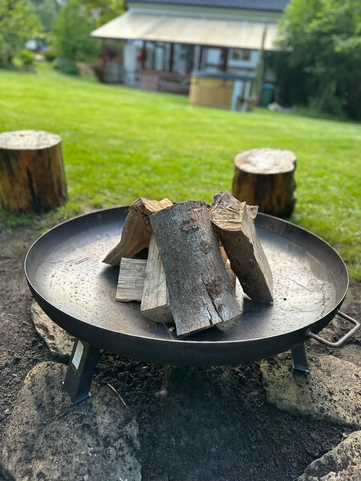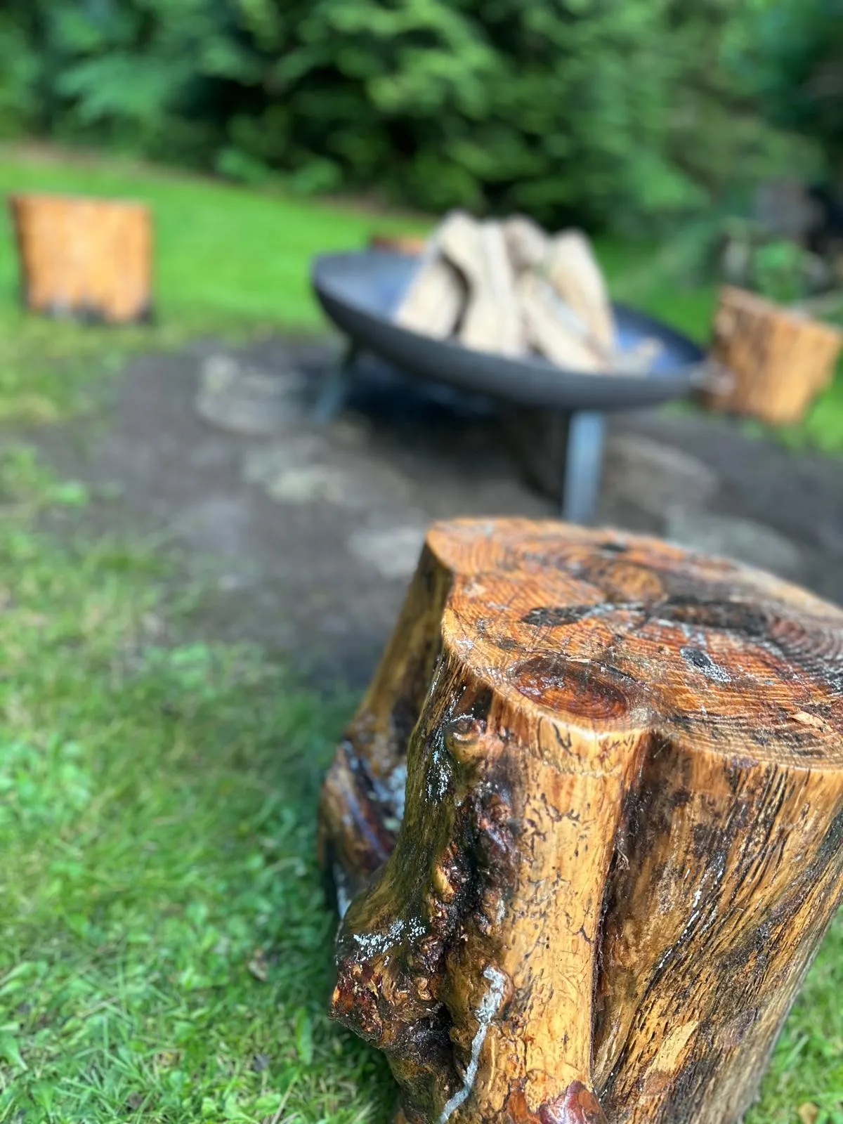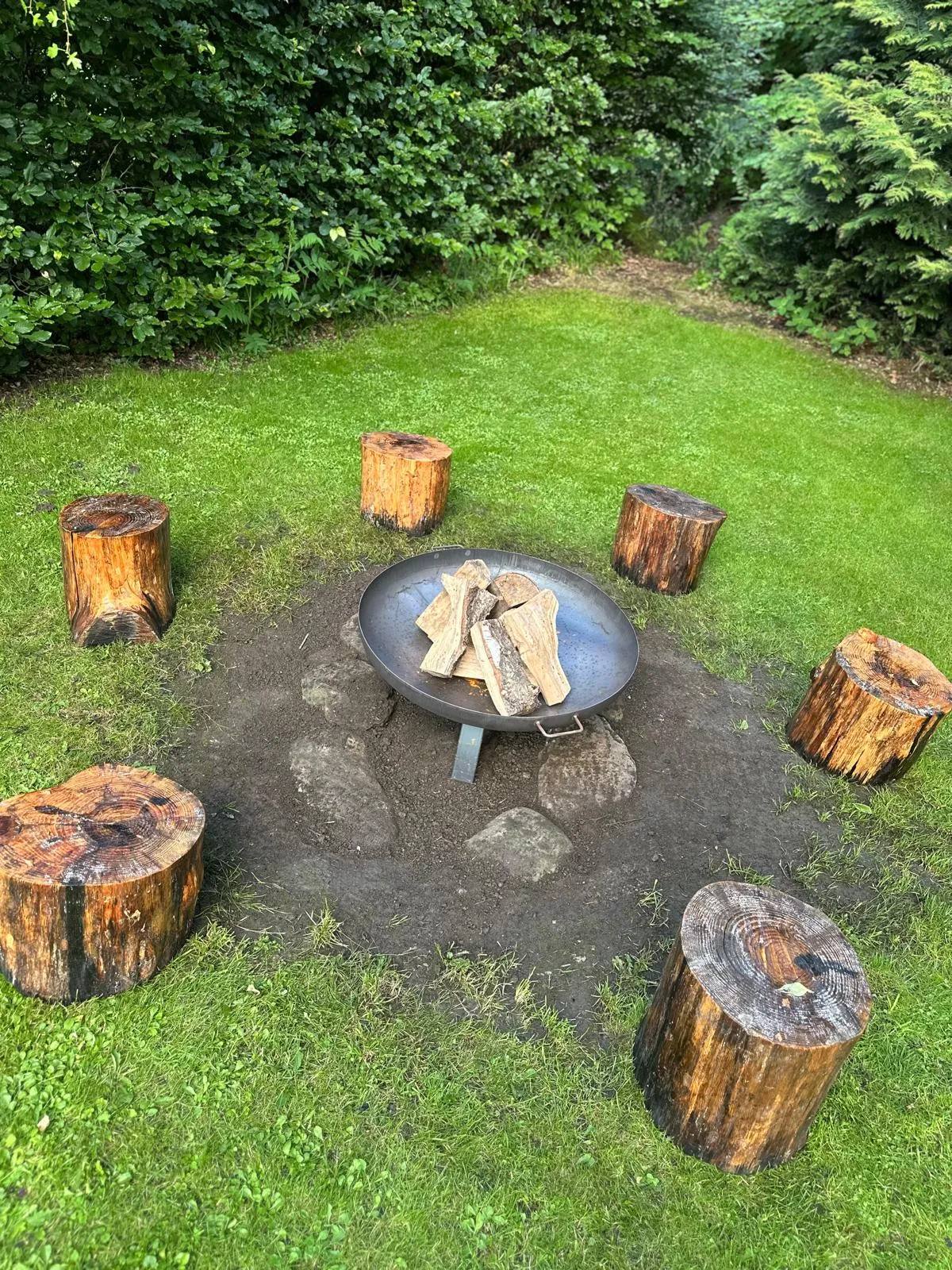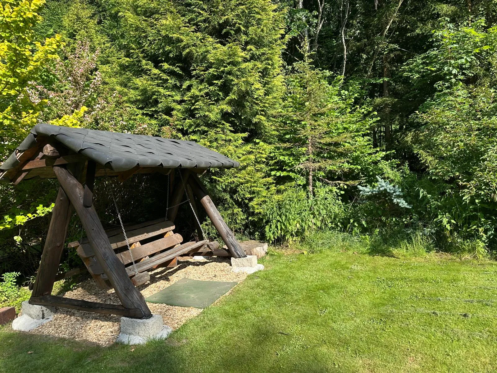 Udržovaná zahrada s otevřeným ohništěm a dřevěnou houpačkou je ideálním místem pro odpočinek a hry.