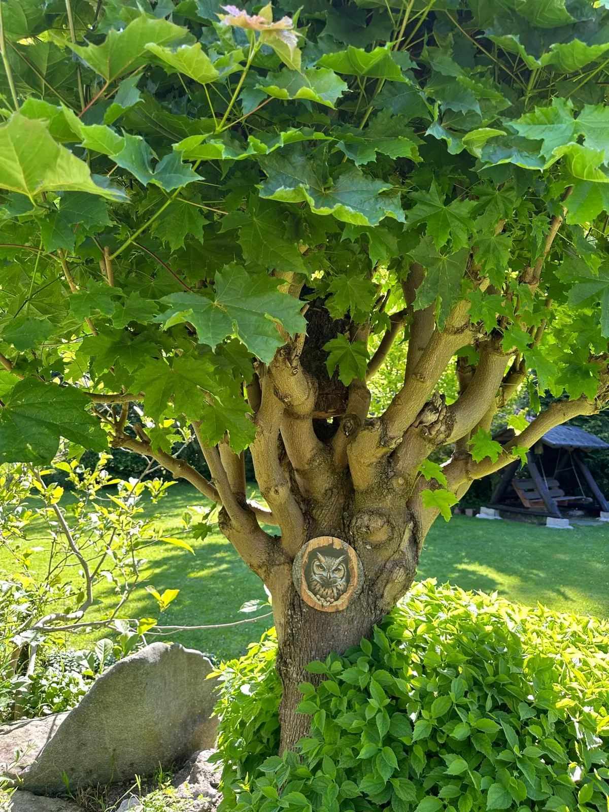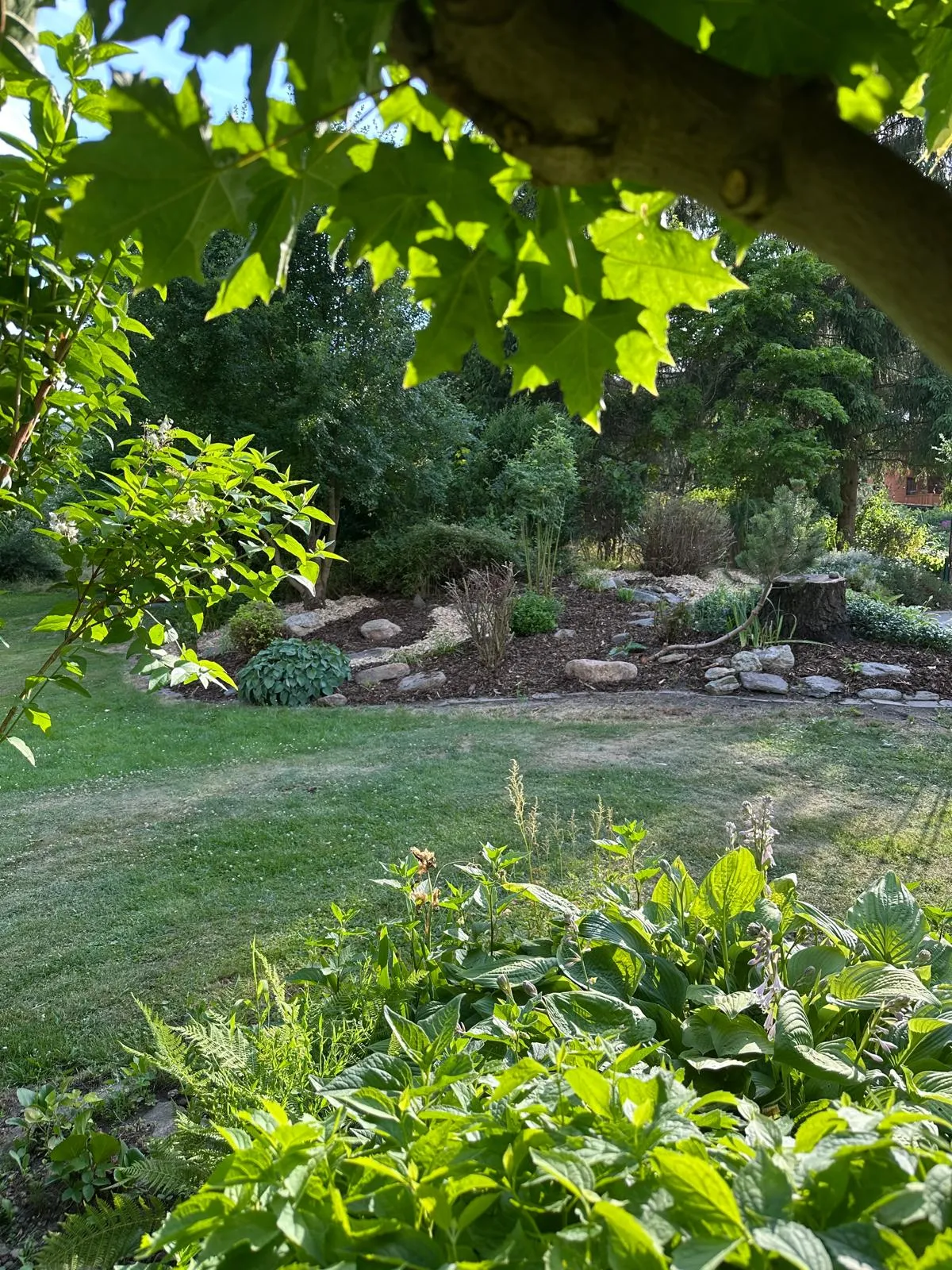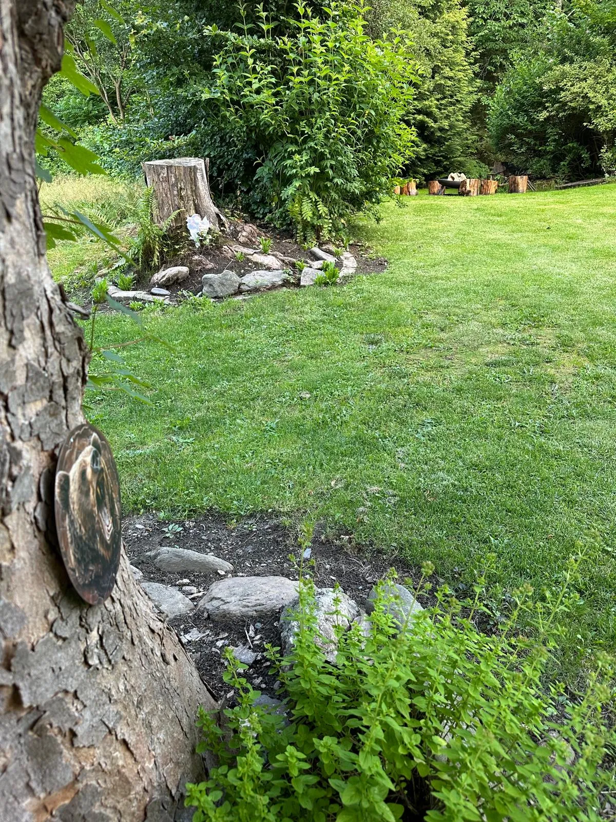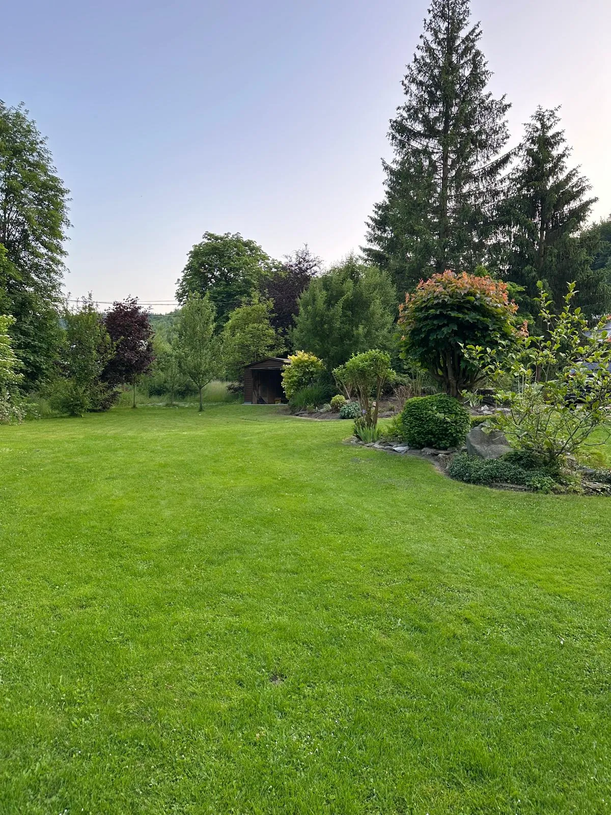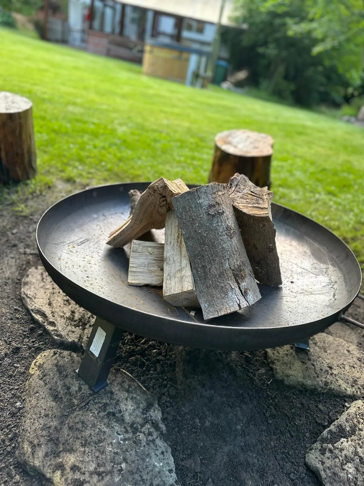 Udržovaná zahrada s otevřeným ohništěm a dřevěnou houpačkou je ideálním místem pro odpočinek a hry.