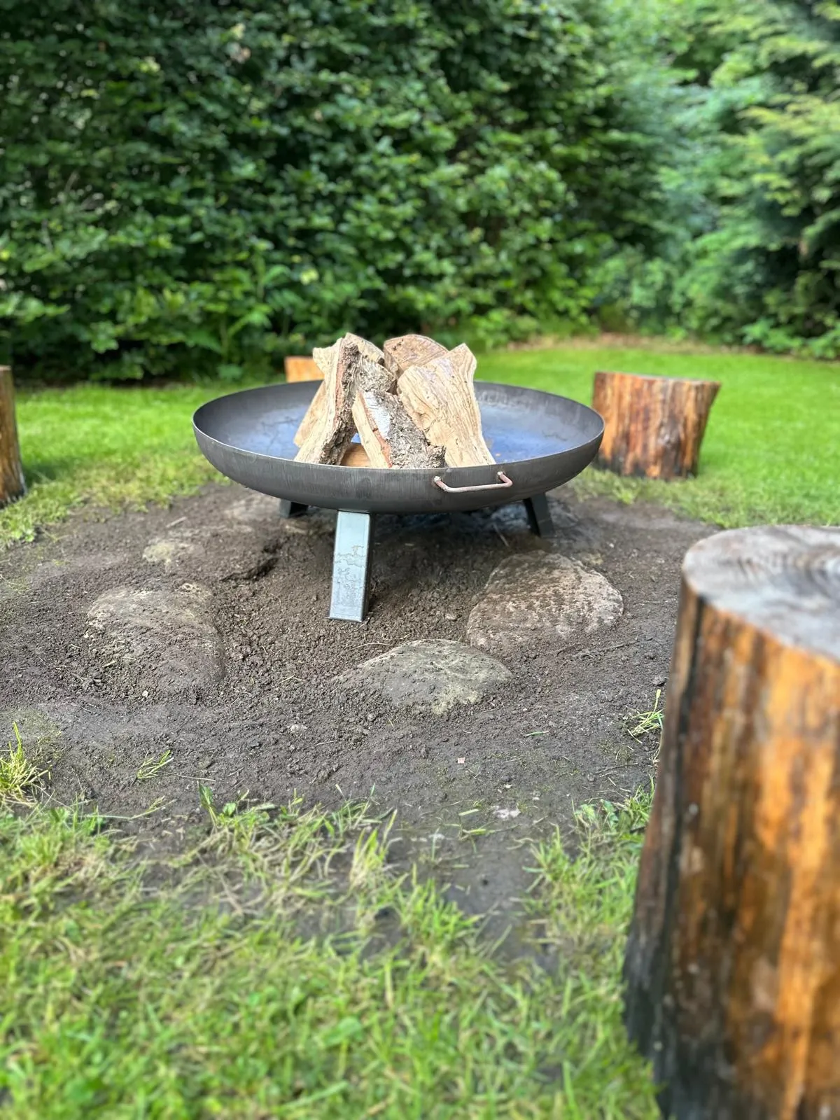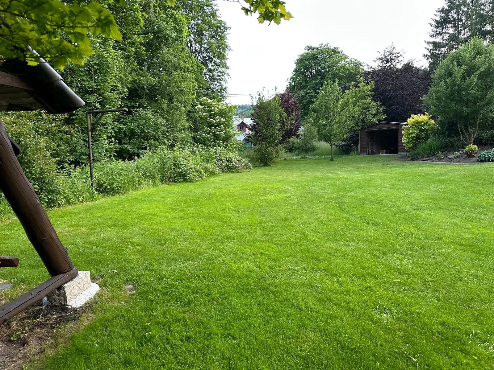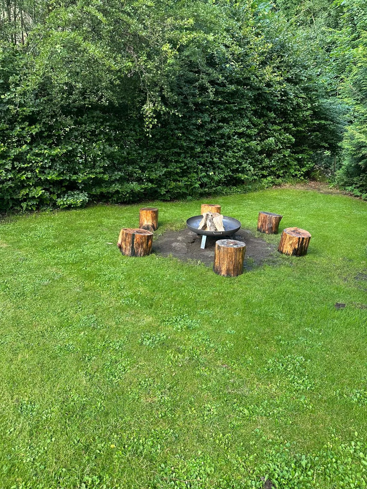 Udržovaná zahrada s otevřeným ohništěm a dřevěnou houpačkou je ideálním místem pro odpočinek a hry.